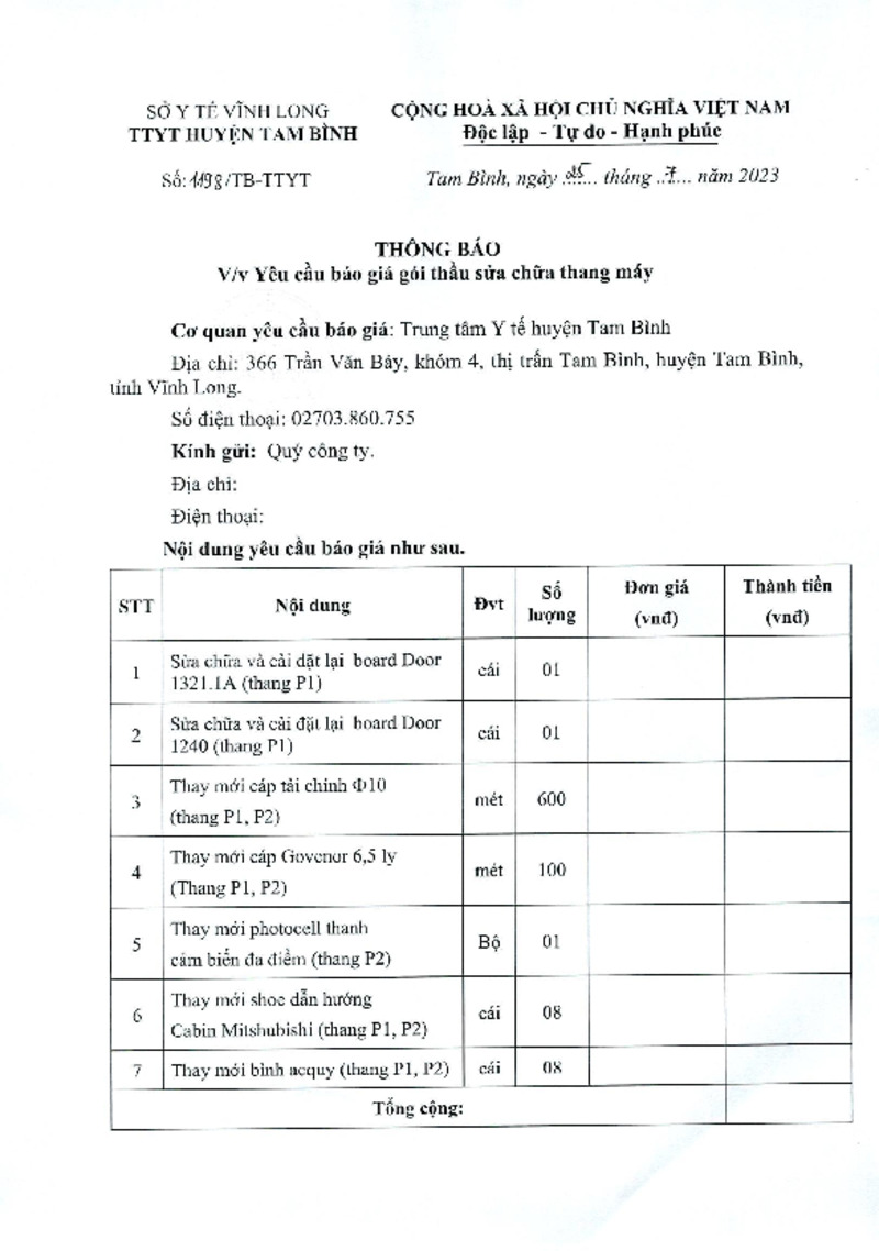 | Tiêu đề văn bản | Thông báo về việc yêu cầu báo giá gói thầu sửa chữa thang máy | ||